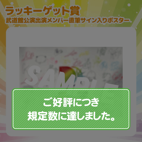 DDP in 日本武道館記念 〜カラフルニューイヤー ライブ写真くじ〜をご購入いただいた方の中から、抽選で2名様に「武道館公演出演メンバー直筆サイン入りポスター」をプレゼント!! ※公演当日に出演メンバー48名に書いていただいた直筆サイン入りポスターです!! ※活動休止中のラムネ商店街・橙野電機を除いた48名となります。 ※販売期間内であっても上限人数が当選した時点で終了となります。 ※規定数に達した為、終了しました。